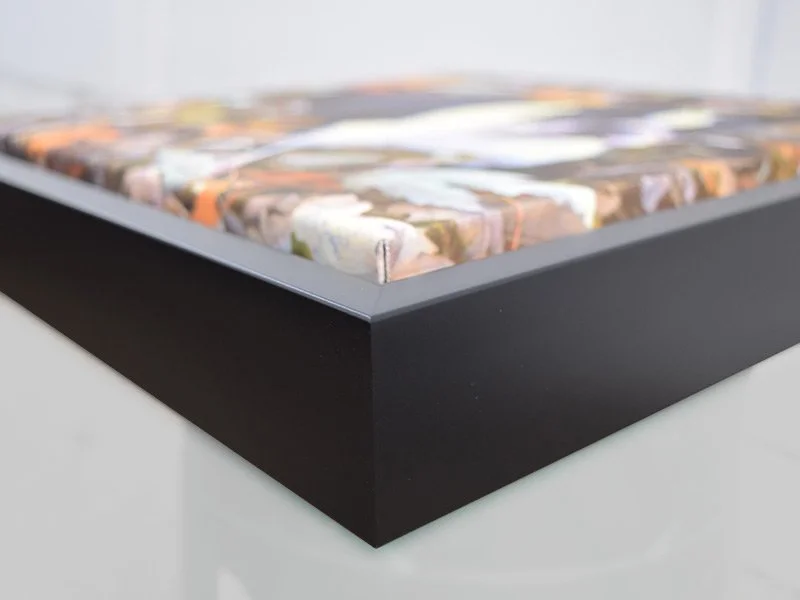 Traditionally floater frames are used to rest behind a stretched canvas. It gives a clean, contemporary look.
