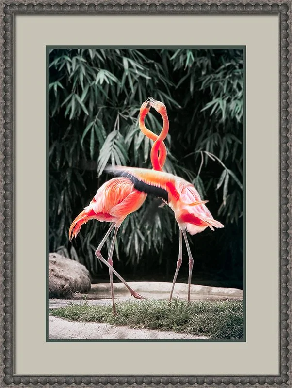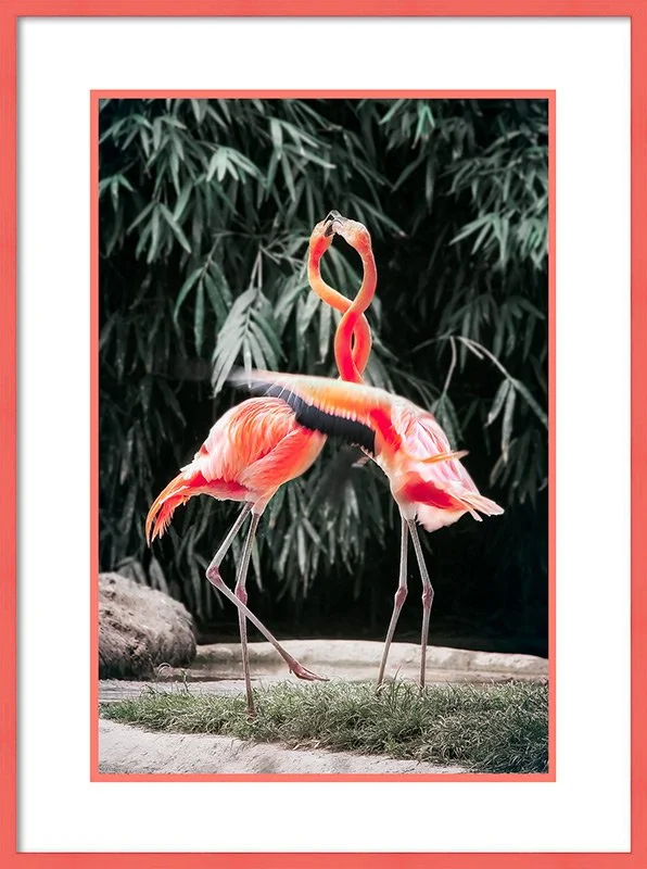 A better approach? Pull colors from the background rather than the focal pinks. This lets the flamingos shine while the frame subtly complements the piece. Suddenly, the flamingos are easy to focus on — exactly where they should be.