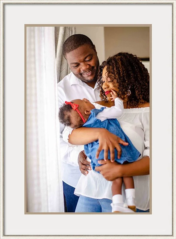 If the goal is to highlight the baby, use the framing to guide the viewer’s eye straight to the focal point. Let the outfit’s bold color stand out on its own rather than compete with the frame. In this case, a soft white mat won’t interfere with the blue outfit, allowing attention to fall naturally on the baby and the parents’ delighted faces.